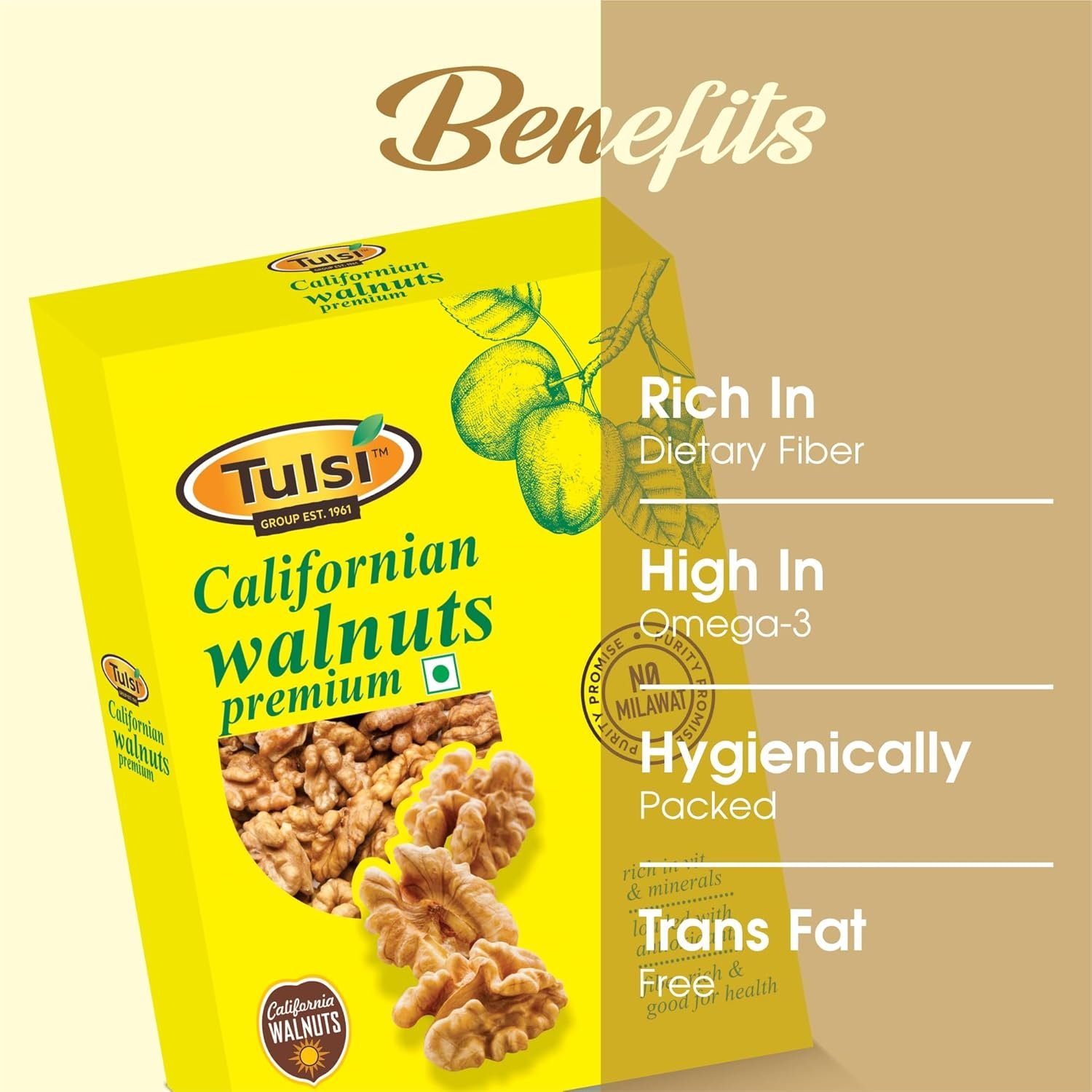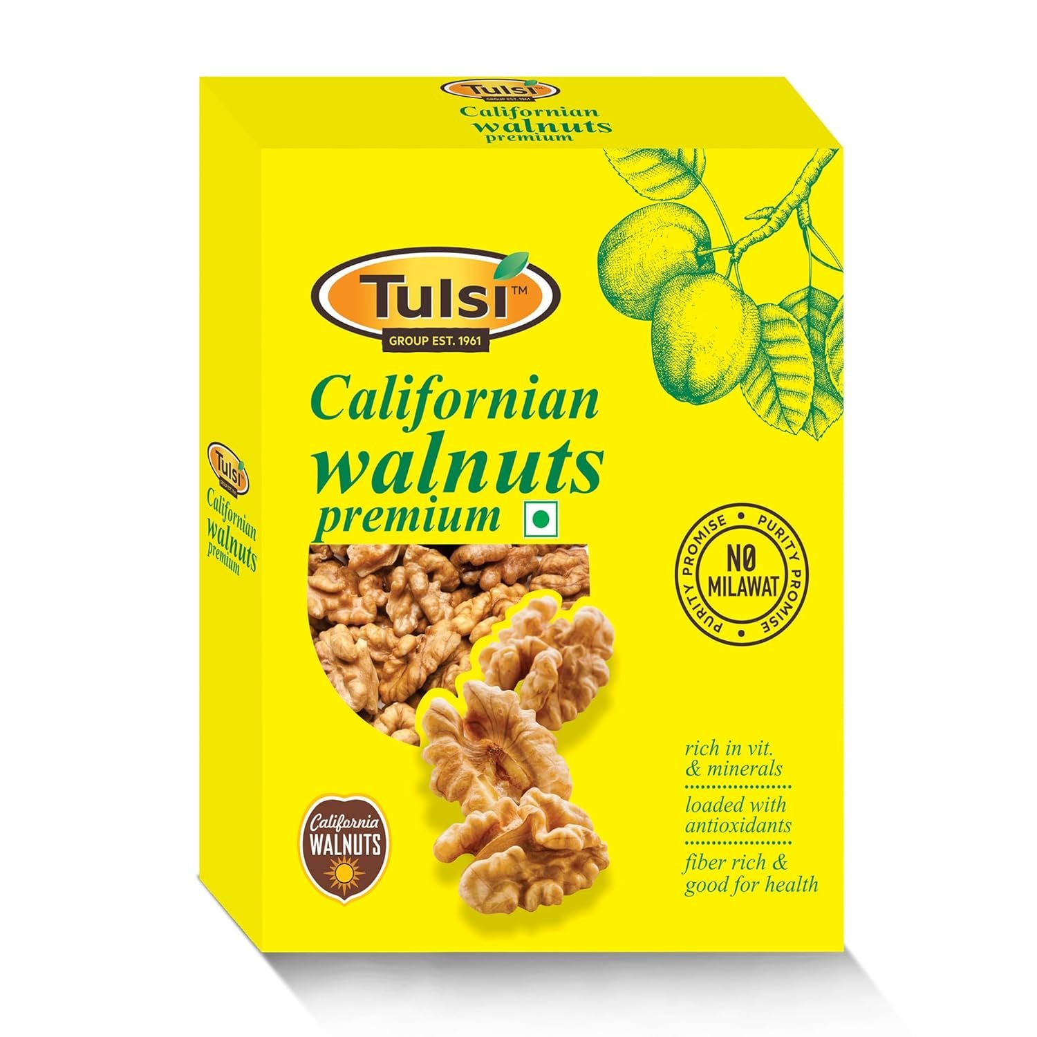 Indulge in the wholesome taste and health benefits of Tulsi California Walnut Kernels Premium 200g โ premium large walnut halves sourced from California for superior quality, crunch, and flavor. These light-colored, shell-free walnut halves are not only delicious but also packed with nutrition, including omega-3 fatty acids, protein, dietary fibre, and antioxidants.